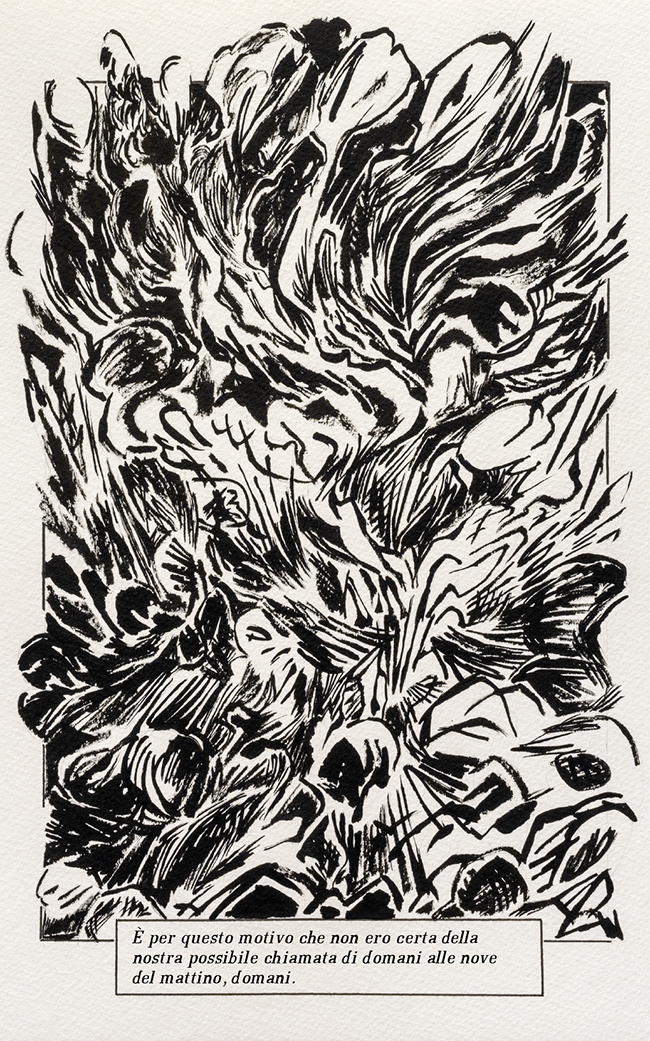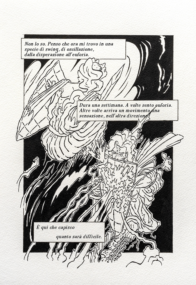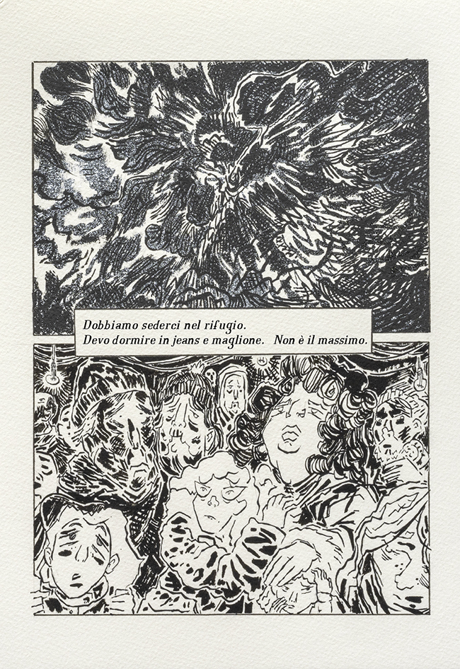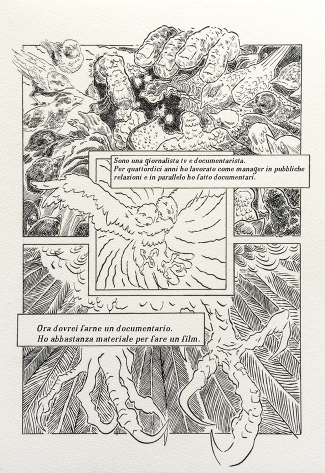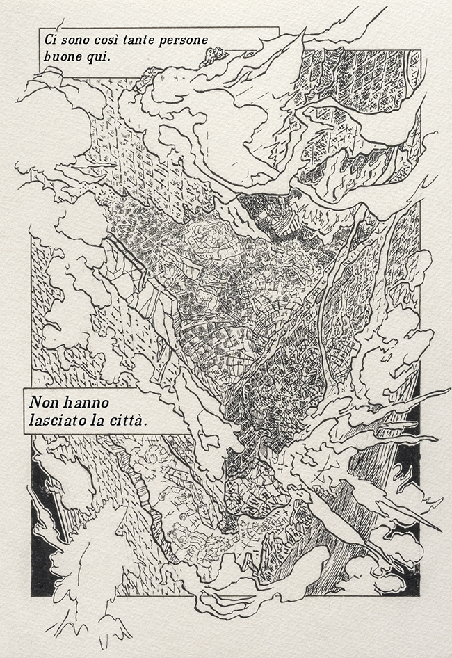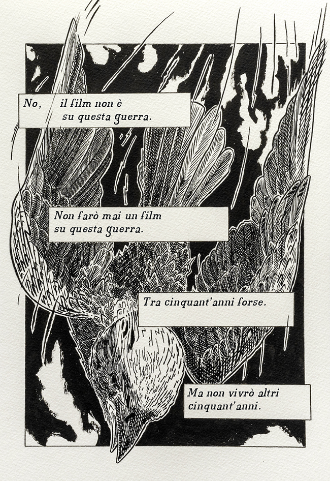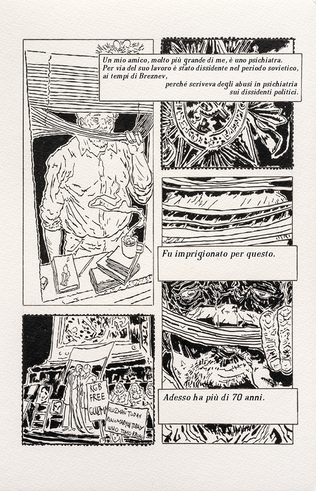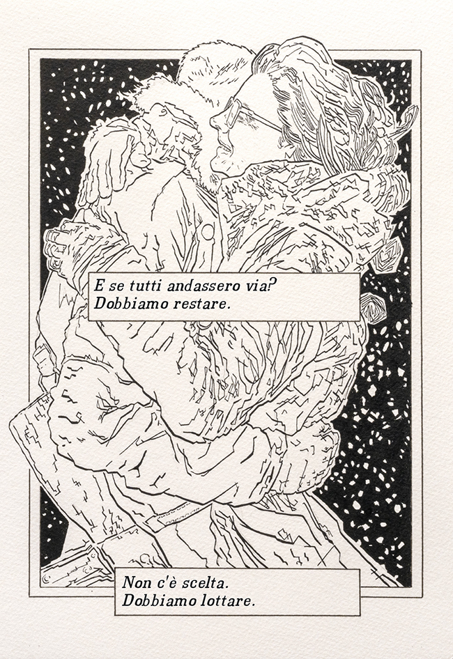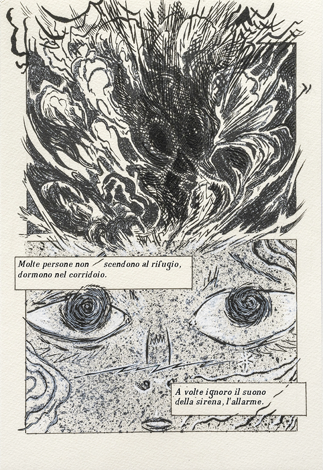 La notte del 3 marzo sono entrato in contatto con questa donna a Kyiv. Abbiamo potuto fare una sessione di ascolto di 47 minuti che ho trascritto parola per parola per restituirla fedelmente, come per Scribblitti e per gli altri progetti basati sull’ascolto che porto avanti. Poi è suonato l’allarme anti aereo e ci siamo salutati. Dal mattino dopo fino al 6 Aprile ho disegnato senza risparmiarmi. Spero che questa storia possa essere di aiuto per capire quanto sia importante mettere le persone al centro ed aiutarle con ogni mezzo che si ha a disposizione.
