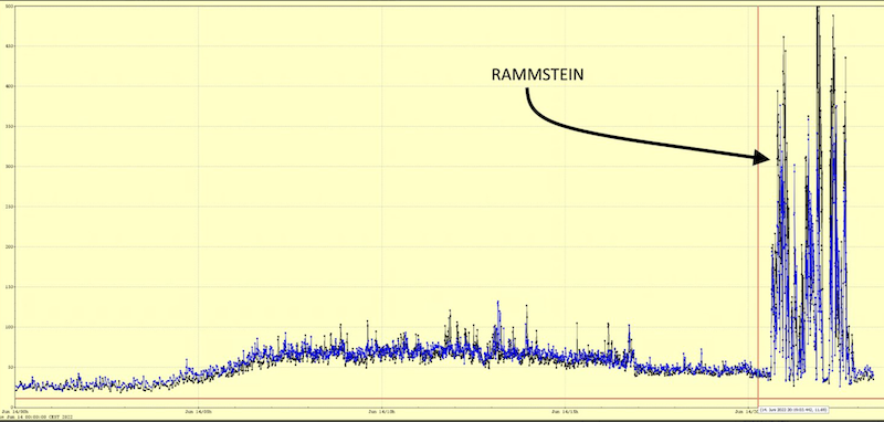 Il 15 giugno i Rammstein, una famosa band metal tedesca, hanno suonato allo stadio Volkspark di Amburgo, a poco più di due chilometri di distanza dal centro di ricerca Desy, dove si trova un acceleratore di particelle utilizzato per diversi esperimenti scientifici. Uno dei sensori dell’esperimento, installato per osservare le vibrazioni trasversali del suolo, si è decisamente accorto che a poca distanza stava succedendo qualcosa di anomalo. Lo dimostra il grafico condiviso su Twitter dallo stesso centro Desy, che ha scritto ai Rammstein per fare loro i complimenti: il sismometro non aveva mai registrato livelli così alti durante i concerti che si erano tenuti finora allo stadio Volkspark.