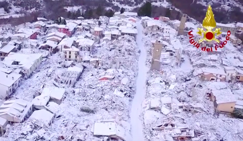 Nella notte fra mercoledì 4 e giovedì 5 gennaio ha nevicato ad Amatrice ed Accumoli, i due comuni più colpiti dalle scosse di terremoto che hanno interessato questa estate l’Italia centrale. La neve è ben visibile da alcune riprese effettuate probabilmente con un drone e diffuse dai Vigili del fuoco. Sia ad Amatrice che ad Accumoli sono previste neve e temperature diversi gradi sotto lo zero venerdì 6 e sabato 7 gennaio.