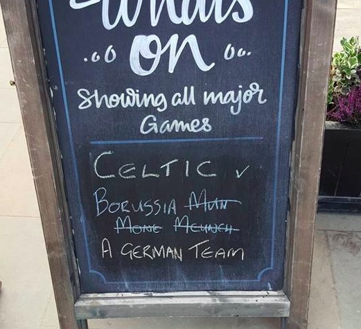 Gli appassionati di calcio sanno bene quanto sia difficile pronunciare – e tanto più scrivere – al primo colpo il nome del Borussia Mönchengladbach, una squadra di calcio tedesca di Mönchengladbach, città di 250mila abitanti vicino al confine con i Paesi Bassi. Il Borussia Mönchengladbach è da anni tra le migliori squadre della Bundesliga, il principale campionato di calcio tedesco, e partecipa spesso alla Champions League (l’anno scorso era nello stesso girone della Juventus). Capita spesso di doverne pronunciare il nome, meno di pronunciarlo giusto. L’account in inglese della squadra ha diffuso una foto di un pub – probabilmente scozzese – con una lavagna che annuncia la proiezione della partita di stasera tra Celtic e Borussia Mönchengladbach. Al posto del nome giusto, però, c’è scritto “Una squadra tedesca”. L’account l’ha presa sul ridere, e ha cambiato il proprio nome in “A German Team”.