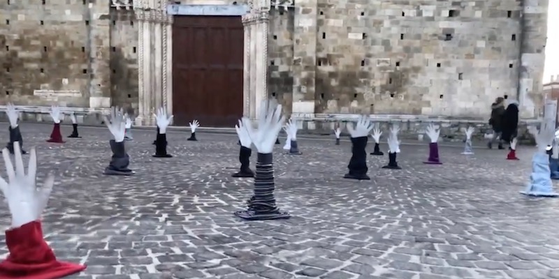 L’installazione con le mani che affondano ad Atri, contro Salvini