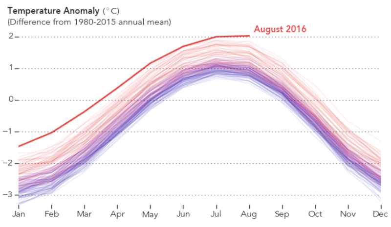 Il Goddard Institute for Space Studies (GISS) della NASA ha stimato che agosto 2016 è stato il mese più caldo degli ultimi 136 anni, subito dopo luglio 2016. Queste stime sono state realizzate considerando le temperature di tutto il pianeta. L’ultimo agosto più caldo fin qui era stato quello del 2014, la cui temperatura media è inferiore di 0,16 gradi a quella del mese scorso. Se si considera la temperatura media di agosto registrata tra il 1951 e il 1980, la differenza è di 0,98 gradi: gli scienziati del GISS hanno specificato che sono gli andamenti a lungo termine ad avere un significato scientifico, e mostrano come effettivamente le temperature stiano salendo.