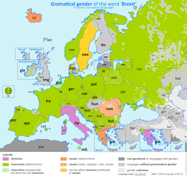 La Grecia è colorata in due modi diversi perché in greco si usano due diverse parole per dire “Brexit”: oltre a “Brexit”, che è usato come neutro, si usa anche un calco in alfabeto greco che invece è femminile.