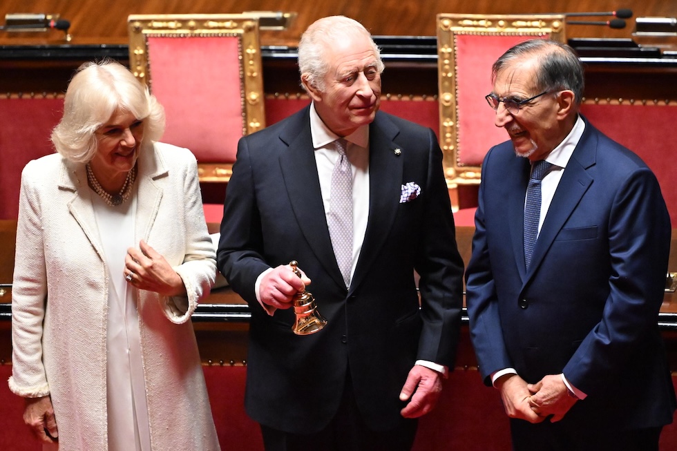 Camilla e Carlo III insieme al presidente del Senato Ignazio La Russa nell’aula di Montecitorio a Roma, 9 aprile 2025 (ANSA/MAURIZIO BRAMBATTI)