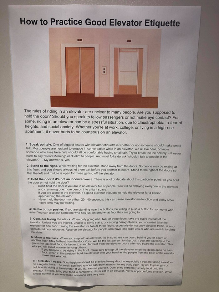 Chase Burns, che collabora col sito The Stranger, vive a Seattle e ha raccontato di aver trovato nell’ascensore del suo palazzo una dettagliatissima guida di comportamento che ha descritto come «molto Seattle» (e sui social network viene definita «la cosa più Seattle di sempre». Eccola tradotta per intero, magari vi torna utile: