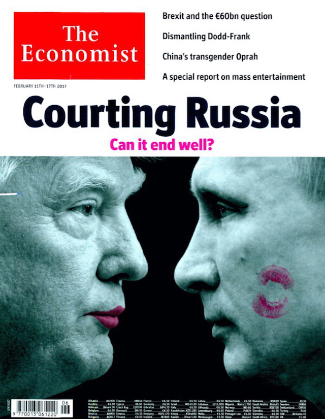 Il numero della rivista settimanale Economist che uscirà l’11 febbraio ha in copertina il presidente degli Stati Uniti Donald Trump e il presidente russo Vladimir Putin. Il titolo è Courting Russia. Can it end well?, cioè “Corteggiando la Russia. Può finire bene?”. Nell’immagine Trump ha del rossetto sulle labbra e ha appena dato un bacio sulla guancia a Putin.