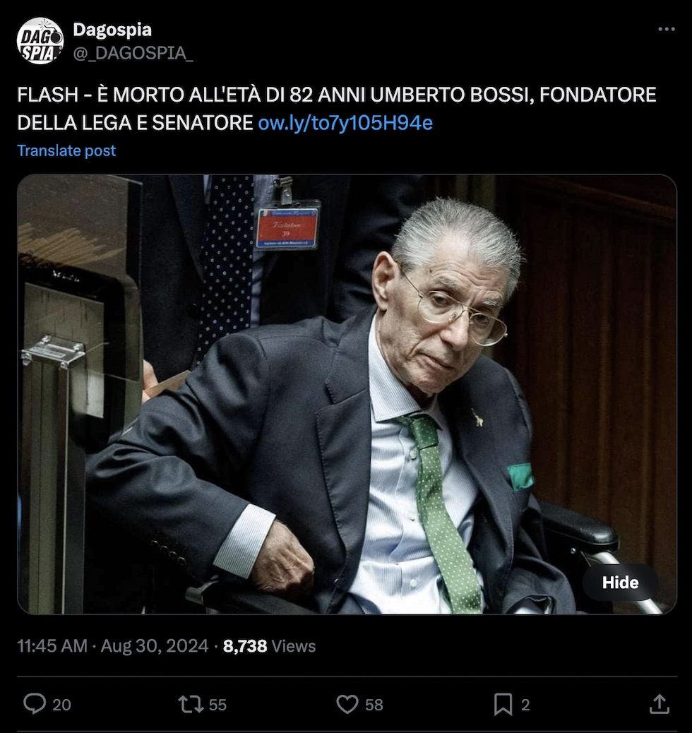 Mentre circolavano alcune voci sulla morte del fondatore della Lega Umberto Bossi, in condizioni di salute precarie già da molto tempo, venerdì mattina il sito di gossip e contenuti di bassa qualità Dagospia ha pubblicato la notizia che dava la morte come avvenuta.