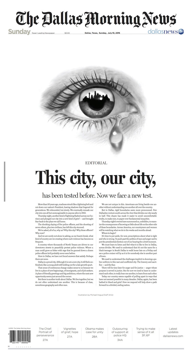 Il Dallas Morning News, il più importante quotidiano di Dallas, ha pubblicato una prima pagina speciale per la prima edizione domenicale del giornale dopo la strage di giovedì sera, durante la quale un attentatore ha ucciso 5 agenti di polizia della città. La prima pagina contiene solamente un disegno di un occhio da cui scende una lacrima e un editoriale dal titolo “Questa città, la nostra città, in passato è stata messa alla prova. Ora ne affrontiamo un’altra”. Poynter fa notare che era dal 12 settembre 2001 che il Dallas Morning News non pubblicava una prima pagina contenente solo un editoriale.