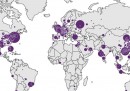 Il sito di urbanistica City Lab ha parlato di una ricerca del Martin Prosperity Institute, un centro studi canadese che si occupa di economia, che prendendo i dati della rivista Forbes sugli oltre 1.800 miliardari che ci sono nel mondo (gente la cui ricchezza complessiva era, nel 2015, di settemila miliardi di dollari) ne ha ricavato una mappa che mostra dove vivono. Un terzo dei miliardari vive negli Stati Uniti, il 12,2 per cento in Cina e il 4,5 per cento in India e Russia. La città con più miliardari è New York: ce ne sono 116, il 6,4 per cento del totale. Seguono: l’area di San Francisco, Mosca, Hong Kong, Los Angeles e Londra. Queste posizioni restano uguali (ci sono solo Londra e Los Angeles che si scambiano posto in classifica) se si guarda alla ricchezza complessiva dei miliardari che vivono in ogni città (la seconda immagine). A New York è di 537 miliardi di euro, il 7,6 per cento del totale.