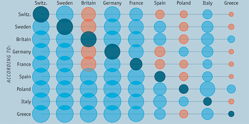 L’Economist ha pubblicato un grafico che mostra, in base a dati raccolti dal progetto Livewhat, cosa pensano i cittadini di alcuni paesi europei delle condizioni di vita in diversi paesi europei (compreso il loro). In generale, spiega l’Economist, gli europei pensano che negli altri paesi più importanti si viva molto bene, e in media i cittadini degli altri paesi europei pensano che in Italia si viva bene, meglio di quanto pensino gli italiani. I paesi più scettici sulle condizioni altrui sono Svizzera e Francia, dove i cittadini contattati hanno detto che nel Regno Unito, in Spagna, in Polonia e in Grecia si viva peggio di quanto ritengono i rispettivi abitanti.