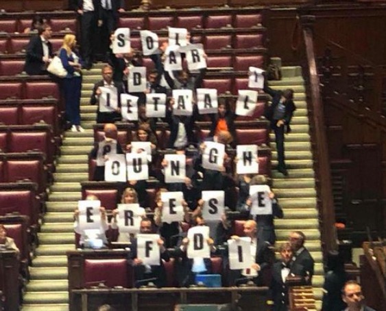 Mercoledì i deputati di Fratelli d’Italia hanno esposto alla Camera dei cartelli per dirsi vicini «al popolo ungherese», dopo che il Parlamento europeo aveva approvato la mozione che applica l’articolo 7 del Trattato di Lisbona – che sanziona i paesi membri ritenuti in contrasto con i valori fondanti dell’Unione Europea – nei confronti dell’Ungheria. La coreografia è però riuscita piuttosto male: i cartelli dovevano formare la scritta «Solidarietà al popolo ungherese FdI», ma qualcosa è andato storto e ne è uscita una frase incomprensibile. La foto è stata molto condivisa dai social network nelle ultime ore.