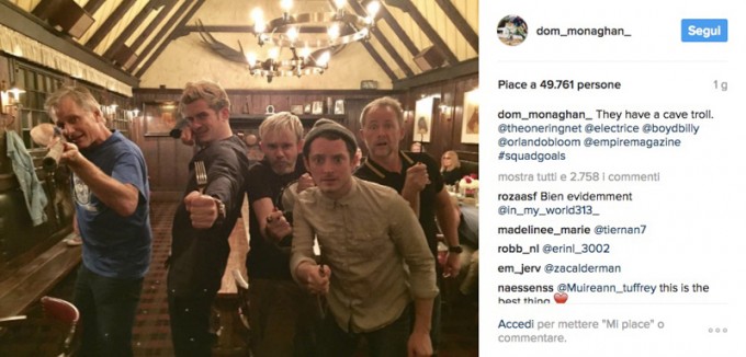Dominic Monaghan, l’attore che interpretava Merry nella trilogia del Signore degli anelli (ma famoso anche per essere stato Charlie in Lost), ha pubblicato su Instagram una foto che lo mostra insieme a una serie di altri attori protagonisti dei film ispirati alla saga di J.R.R. Tolkien: Viggo Mortensen (che faceva Aragorn), Orlando Bloom (Legolas), Billy Boyd (Pipino) e Elijah Wood (Frodo). Sono passati 14 anni dall’uscita del Ritorno del Re, l’ultimo film della trilogia del Signore degli Anelli.