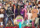 La notte dell’elezione di Donald Trump a presidente degli Stati Uniti, l’artista britannico Chris Baker ha deciso di raccogliere in un unico disegno tutte le cose inaspettate che sono successe nel 2016, dalla morte di David Bowie a Brexit alla vittoria del Leicester in Premier League. Baker ha raccontato in un post su Tumblr che all’inizio non pensava di riprodurre la famosa copertina del disco dei Beatles Sgt.Pepper’s Lonely Hearts Club Band, come poi ha fatto, ma poi ha capito che, nonostante fosse un cliché piuttosto abusato, era il modo migliore per metterci dentro tutte le persone morte quest’anno. Inizialmente voleva anche metterci più riferimenti a cose diverse dalle morti di personaggi famosi, ma poi ha cambiato idea: «soprattutto perché ho pensato che la gente non volesse più vedere la faccia di Nigel Farage che ride». Tre ore dopo Baker ha condiviso l’immagine su Twitter, ed è stata ritwittata migliaia di volte. Da inizio novembre Baker ha continuato a condividere nuove versioni dell’immagine, aggiungendo per esempio Leonard Cohen, il logo del Chapecoense, la squadra brasiliana i cui giocatori sono morti in un incidente aereo qualche settimana fa, e infine George Michael e Carrie Fisher, morti negli scorsi giorni. Nell’immagine Fisher appare come la principessa Leia, il suo personaggio di Star Wars, proiettata dal droide R2-D2, che nel film era mosso dall’attore Kenny Baker, morto anche lui quest’anno.
