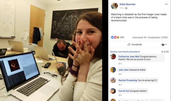 La 29enne scienziata informatica Katie Bouman, assistente professoressa al California Institute of Technology, ha pubblicato su Facebook la foto della faccia che ha fatto quando ha ottenuto per la prima volta sul suo computer l’immagine del buco nero di cui si parla da ieri. Bouman è stata una delle protagoniste del lungo e complesso lavoro che ha portato a ottenere l’immagine, processando grandissime quantità di dati ottenuti dalle osservazioni di vari radiotelescopi sparsi per il pianeta (il sistema utilizzato è descritto più nel dettaglio qui). In particolare tre anni fa, mentre era ricercatrice al Massachusetts Institute of Technology, Bouman creò uno degli algoritmi che sono stati fondamentali nel processo di elaborazione dei dati che hanno prodotto l’immagine.