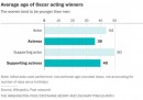 Quest’anno gli attori che hanno vinto l’Oscar sono Leonardo DiCaprio (41 anni) e Mark Rylance (56 anni), rispettivamente per miglior attore protagonista e non protagonista. Le attrici che lo hanno vinto invece sono Brie Larson (26 anni) e Alicia Vikander (27 anni), per attrice protagonista e non protagonista. Il Washington Post ha realizzato due grafici per mostrare come esista una notevole differenza tra l’età media degli attori che vincono l’Oscar e quella delle attrici: la prima è infatti molto più alta della seconda, e questo significa che gli attori maschi hanno la possibilità di vincere il premio anche dopo molti anni di carriera, mentre per le donne questa “finestra” si chiude normalmente prima. Tre delle cinque candidate per la migliore attrice protagonista quest’anno avevano infatti dai 20 ai 29 anni, mentre l’attore più giovane candidato per lo stesso premio era Eddie Redmayne, che ha 34 anni. L’età media che hanno gli attori che vincono l’Oscar come protagonisti è 44, quella delle attrici 36. L’età media degli attori che vincono il premio come miglior attore non protagonista è invece 50 anni, quella delle donne 40.