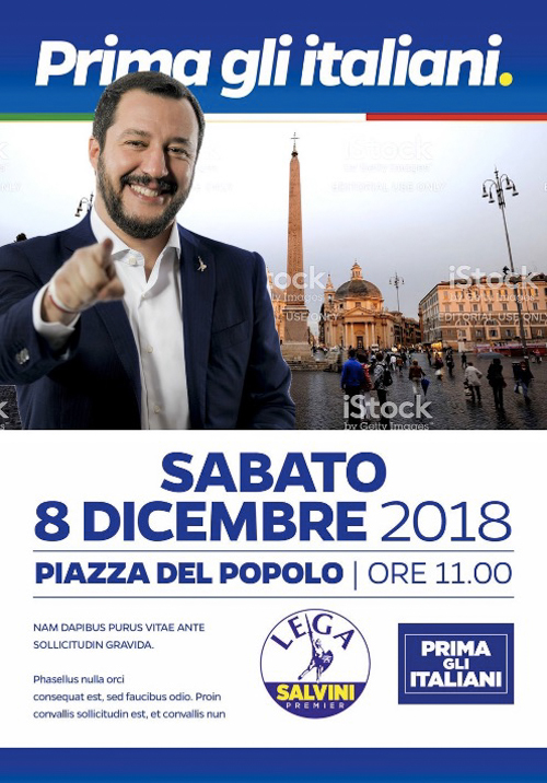 In una locandina condivisa su Twitter dal ministro dell’Interno Matteo Salvini per pubblicizzare un comizio a Roma ci sono due dettagli particolari che hanno attirato qualche attenzione e presa in giro su Twitter. Il primo è la foto di piazza del Popolo, che ha il watermark “iStock”, a indicare che è stata usata una versione gratuita di una foto a pagamento. Il secondo è il testo in basso (lo vedete cliccando sull’immagine) che consiste in una frase latina, usata normalmente in tipografia per le bozze e le prove grafiche: il cosiddetto “lorem ipsum”.