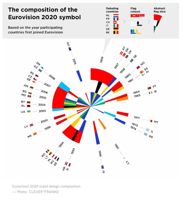 L’agenzia che ha realizzato il logo, CLEVER°FRANKE, ha anche pubblicato una specie di legenda, con gli anni di ciascuna nuova aggiunta all’Eurovision.