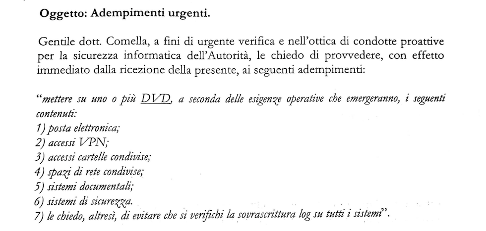 Nella mail del 4 novembre Fanizza chiede a Comella di mettere «su uno o più DVD» moltissime informazioni personali dei dipendenti: la posta elettronica, gli accessi alle cartelle condivise, i sistemi documentali e quelli di sicurezza. Alla fine della mail Fanizza specifica che la sua richiesta «ha carattere riservato e interpersonale» tra lui e Comella.