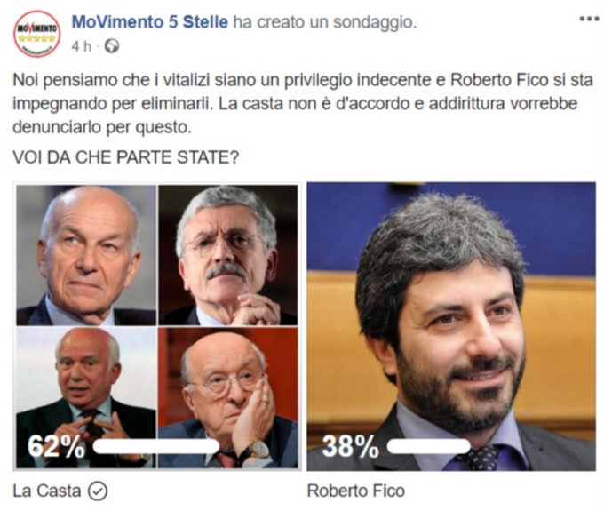 La pagina Facebook del Movimento 5 Stelle ha rimosso un sondaggio che chiedeva agli iscritti se preferissero “la Casta” o il presidente della Camera Roberto Fico, perché la maggior parte dei votanti aveva scelto la Casta. Il sondaggio parlava dei vitalizi degli ex parlamentari – un tema su cui Fico sta litigando con la presidente del Senato Maria Elisabetta Alberti Casellati – chiedendo platealmente: “VOI DA CHE PARTE STATE?” Pochi minuti prima della rimozione del post, il 62 per cento dei votanti aveva scelto la Casta, rappresentata dalle foto di Fausto Bertinotti, Massimo D’Alema, Paolo Cirino Pomicino e Ciriaco De Mita.