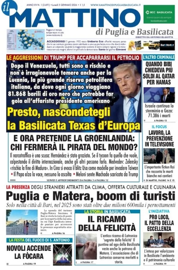 Sul Mattino di Puglia e Basilicata l’argomento del petrolio lucano è usato in modo molto sfrontato come pretesto per parlare con toni particolarmente critici dei piani di Trump oltre il Venezuela – visto che ha già minacciato altri paesi –, delle sue violazioni del diritto internazionale e delle conseguenze internazionali che potrebbe avere questo attacco, Basilicata a parte.