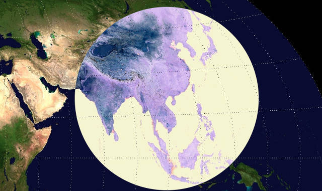 Quest’immagine, che ciclicamente torna a circolare sui social network, mostra l’area nel sudest asiatico – dall’India al Giappone e dall’Indonesia alla Cina – in cui vive più della metà della popolazione mondiale (al momento siamo circa sette miliardi e mezzo, CIRCA). Da quando l’immagine ha iniziato a circolare su internet (tre anni almeno) la popolazione mondiale è aumentata, soprattutto grazie al contributo di Cina, India e altri paesi dentro al cerchio: quindi è probabile che l’immagine sia oggi ancora più vera, e lo resterebbe anche diminuendo il diametro del cerchio.