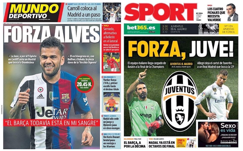 In Spagna i più importanti quotidiani sportivi non vengono accusati da tifosi e lettori di “essere di parte” o di riservare trattamenti di favore a qualche squadra in particolare. Semplicemente, sono dichiaratamente di parte e non fanno nulla per nasconderlo. Marca e As sono i più letti in Spagna e si occupano principalmente delle squadre di Madrid, il Real e l’Atletico, con particolare riguardo nei confronti del Real. Mundo Deportivo e Sport sono i giornali sportivi più letti in Catalogna, si occupano principalmente del Barcellona e ci tengono a fare sapere di non aver un buon rapporto con i rivali storici del Real Madrid, in cui c’è di mezzo anche la questione dell’indipendenza catalana. Queste, per esempio, sono le loro prime pagine di oggi, in cui entrambi sostengono la vittoria della Juventus nella finale di Champions League di stasera. Mundo Deportivo ha in prima pagina una foto di Dani Alves con la maglia della Juventus a cui è stata sovrapposta la metà di quella del Barcellona, squadra di cui è stato uno dei giocatori più importanti fino all’anno scorso. Sport, invece, ci va più diretto e scrive “Forza, Juve!”.