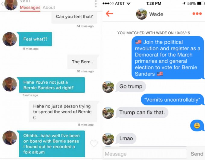 Alcuni sostenitori e sostenitrici di Bernie Sanders, senatore Democratico candidato alle primarie per la presidenza degli Stati Uniti, stanno usando Tinder, un’applicazione di incontri molto diffusa e popolare, per parlare delle elezioni e fare campagna elettorale. Su Tinder quando due utenti si “scelgono” a vicenda e possono cominciare a parlare, la conversazione lanciata da questi sostenitori non ha come obiettivo la conoscenza reciproca e un eventuale incontro, ma la propaganda usando lo slogan “Feel the Bern”. Secondo Buzzfeed e Reuters Tinder ha già bloccato temporaneamente diversi profili per questo motivo.