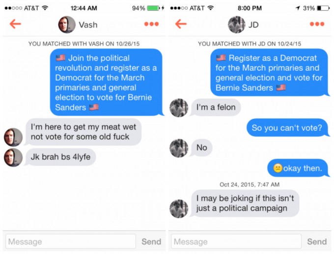 Non è chiaro quanti utenti di Tinder stiano usando l’app in questo modo ma l’idea si sta diffondendo, scrive Buzzfeed. L’iniziativa è indipendente, senza alcun apparente sostegno ufficiale dei responsabili della campagna di Sanders, che non hanno fatto commenti. Coinvolti in una discussione politica, alcuni utenti hanno accettato, altri hanno risposto facendo sapere che sostengono un altro candidato e altri non l’hanno presa bene. I risultati, in questo caso, sono conversazioni piuttosto surreali e in alcuni casi anche sessiste.