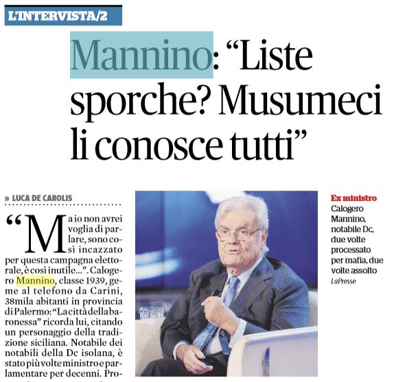 Nell’edizione di oggi il Fatto Quotidiano ha pubblicato un’intervista sulle prossime elezioni in Sicilia che attribuisce a Calogero Antonio Mannino, potente ex ministro della Democrazia Cristiana. In realtà il Fatto ha intervistato la persona sbagliata, come ha ricostruito ANSA: il giornale ha parlato telefonicamente con Antonino Mannino, ex parlamentare del Partito Comunista italiano. È stato lo stesso Antonino Mannino a raccontarlo all’ANSA, mentre Calogero Antonio Mannino ha smentito con una nota di aver parlato con il giornalista in questione.