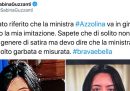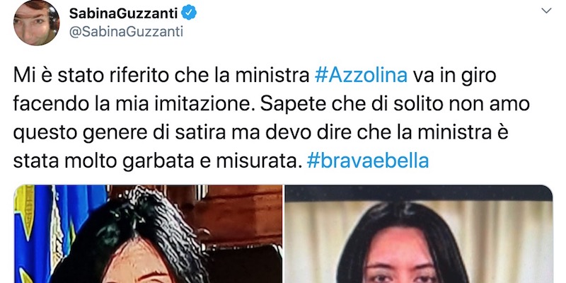 Anche Sabina Guzzanti ha notato la somiglianza tra lei e la ministra dell’Istruzione Lucia Azzolina, che negli ultimi giorni è stata osservata da molte persone sui social network per via dei numerosi interventi della ministra a proposito della chiusura delle scuole e dell’esame di maturità. Guzzanti, attrice comica e imitatrice, tra gli altri, di Maria Elena Boschi, Giorgia Meloni, Virginia Raggi e Daniela Santanchè, ha scherzato sulla somiglianza con Azzolina su Twitter.