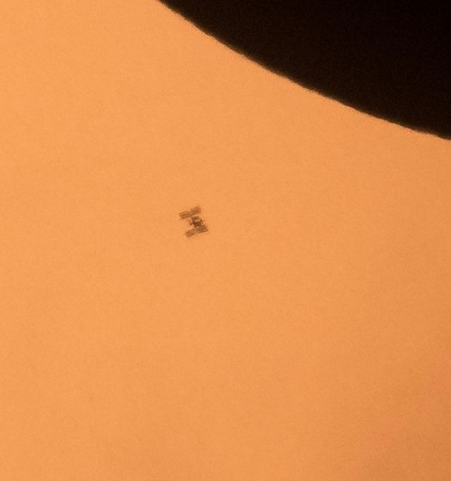 La Stazione Spaziale Internazionale – il grande alloggio/laboratorio che ha questa cosa particolare che sta nello Spazio – ha fatto ieri, durante l’eclissi solare, un notevole photobomb, quella cosa che succede quando si finisce in una foto senza esserne il soggetto. Si vede in questa foto scattata per la NASA da Joel Kowsky, a Banner, in Wyoming. La vedete?