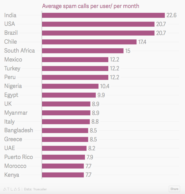 Gli sviluppatori dell’app Truecaller, che permette di riconoscere con maggiore precisione da chi si sta ricevendo una chiamata, hanno diffuso una serie di dati sulle telefonate “spam” ricevute dagli utenti dell’app. Lo studio di Truecaller ha preso in considerazione circa 5,5 miliardi di telefonate “spam” effettuate dall’inizio dell’anno fino a maggio compreso: sono state conteggiate si le chiamate che Truecaller indica da solo come “spam”, sia quelle segnalate dagli utenti. Al primo posto al mondo per telefonate spam in un solo mese c’è l’India, con 22,6 chiamate in media per persona. L’Italia è al 13esimo posto, con 8,8 chiamate.