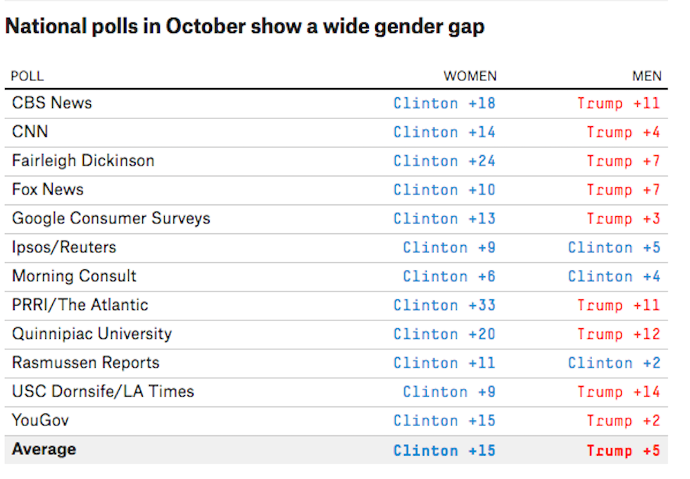 Il sito di news e statistica FiveThirtyEight ha pubblicato un’analisi degli ultimi sondaggi nazionali per le elezioni presidenziali statunitensi divisi per genere. Tutti i sondaggi esaminati mostrano che Hillary Clinton ha un vantaggio molto consistente su Donald Trump fra le elettrici donne: uno dei sondaggi diffusi più di recente, pubblicato dall’Atlantic, mostra Clinton avanti addirittura avanti di 33 punti fra le donne.