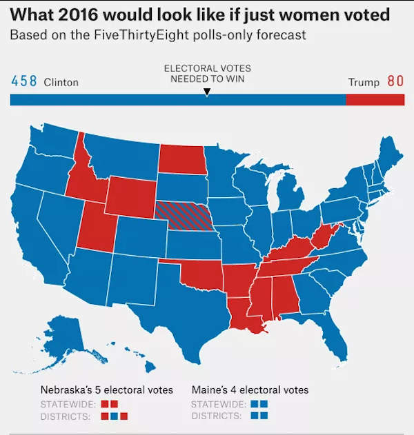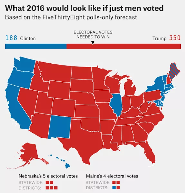 In base a un particolare modello di previsioni, FiveThirtyEight ha mostrato cosa succederebbe in base ai sondaggi se in questo momento votassero solo le donne o solo gli uomini. Nel primo caso vincerebbero nettamente i Democratici, nel secondo caso i Repubblicani.