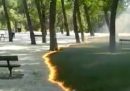 Su Twitter sta girando parecchio un video in cui si vede il prato di un parco coperto di pappi di pioppi (quelle strutture “pelose” bianche con cui i pioppi disperdono i propri semi nel vento, detti anche “pioppini” o “piumini”) su cui avanza un fronte di fiamme basse che bruciano esclusivamente i pappi e non l’erba. Si sente la voce di un uomo che in spagnolo si domanda se chiamare i pompieri.