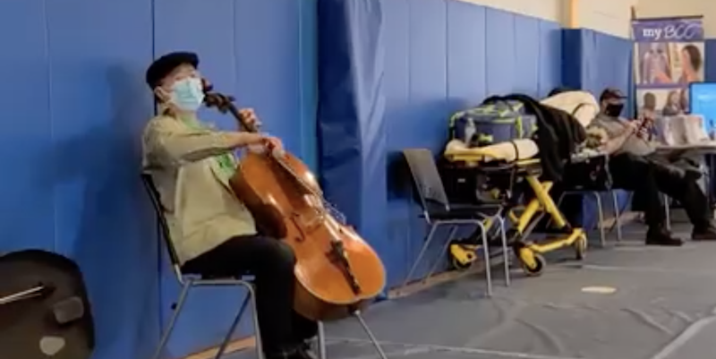 L’esibizione del violoncellista Yo-Yo Ma in un centro vaccinale del Massachusetts