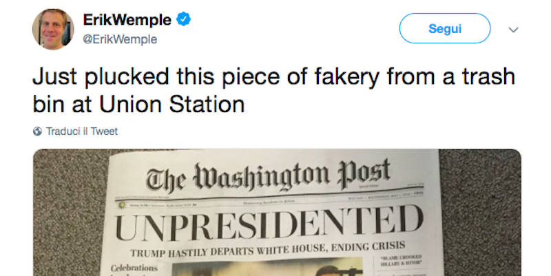 Da stamattina a Washington DC, negli Stati Uniti, circolano delle copie false del Washington Post: un giornale che ne riproduce la grafica ma contiene articoli inventati. L’articolo che apre la prima pagina sostiene che il presidente degli Stati Uniti Donald Trump abbia dato le dimissioni, mentre un altro articolo più in basso dice che il vicepresidente Mike Pence avrebbe prestato giuramento per prendere il suo posto. Il Washington Post ha diffuso un comunicato su Twitter per smentire che sia un giornale vero, e dicendo di stare indagando sulla questione.