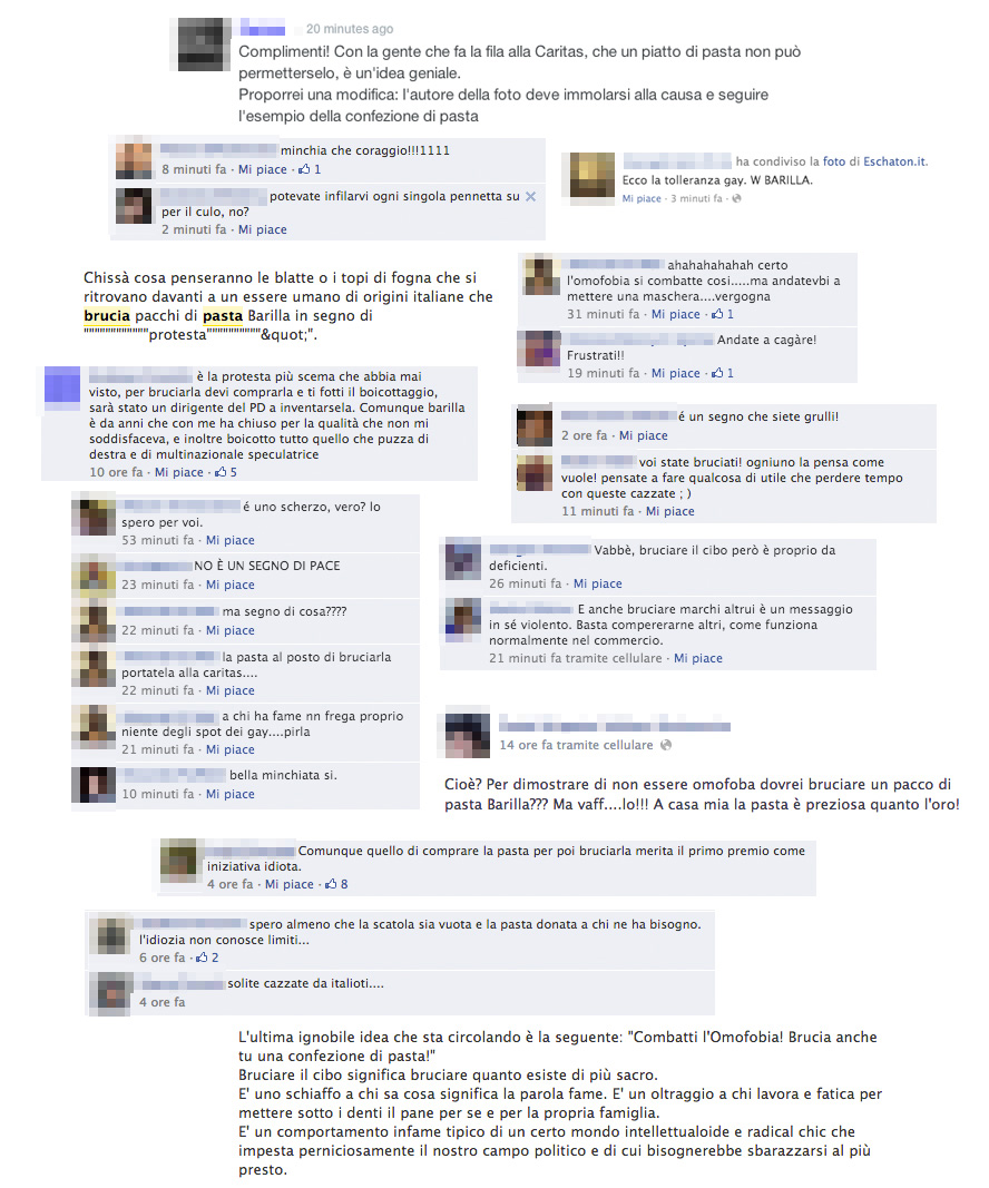 Uno ci ha paragonati a blatte o topi di fogna, un altro a un dirigente del PD. Uno ci ha invitati ad assumere la pasta per via rettale, un altro a dare fuoco a noi stessi. Molti ci hanno fatto notare che è stupido boicottare una marca comprando il loro prodotto per poi distruggerlo, e questo ci ha fatto riflettere. Grazie, davvero.