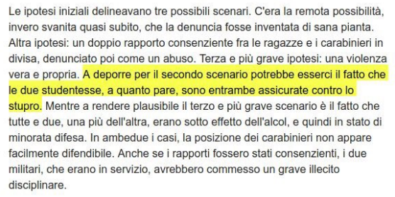 (La frase evidenziata è poi stata trasformata: «A rendere plausibile il terzo e più grave scenario è il fatto che tutte e due, una più dell’altra, erano sotto effetto dell’alcol, e quindi in stato di minorata difesa». La storia dell’assicurazione – riportata anche da altri giornali e che non esclude comunque che il fatto contro cui ci si è assicurati non accada – è stata poi smentita dall’avvocato Gabriele Zanobini, che difende una delle due studentesse: «Le ragazze non hanno nessuna assicurazione antistupro, ma soltanto una generica assicurazione che di prassi le università americane stipulano per i loro studenti che di recano all’estero: è una polizza che riguarda il furto e le rapine e altri tipi di danni, ma loro neppure erano a conoscenza di questa cosa»).