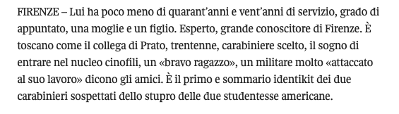 Le cose che si sanno sul caso delle due studentesse americane che hanno accusato due carabinieri di averle stuprate nella notte tra mercoledì e giovedì a Firenze sono tutte qui. Poi ci sono le insinuazioni, la colpevolizzazione, le ipotesi giustificatorie, i dubbi, la costruzione di una possibile “difesa” infilata in narrazioni teatrali, l’insistenza sul fatto che le due ragazze avessero bevuto e fumato, mentre loro sono stati descritti come carabinieri “esperti” o “bravi ragazzi”.