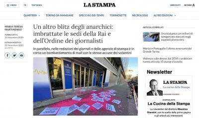 Nel frattempo, nel dare la notizia dell’azione di Non Una di Meno, alcuni giornali hanno parlato di “blitz degli anarchici” (posizionando il tutto in un campo poliziesco e militare che niente ha a che fare con le pratiche femministe, anche di quelle più radicali), di “frange movimentiste” (definendo marginale e periferico un movimento transnazionale come Non Una Di Meno), “di giovanissimi”, «dimostrando grande fantasia nell’attribuire appartenenze politiche, età e generi» a un’azione politica che era firmata, filmata e rivendicata.