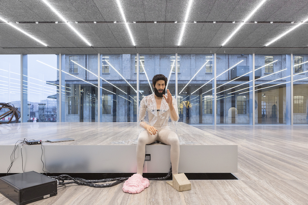 Ora, scrivo queste righe dentro la sala Podium della bellissima Fondazione Prada, a Milano. Di fronte a me siede un androide. Sono qui per la seconda volta in una settimana. L’androide è un’opera dell’artista polacca Goshka Macuga ed è stato fabbricato in Giappone da A Lab. Riproduce le fattezze del fidanzato di Goshka. L’opera s’intitola “To the son of man who ate the scroll”. Circa tre metri mi separano da questa creatura. Siede con le gambe immobili, divaricate, protette da una sorta di guaina contenitiva. Indossa uno spolverino di plastica trasparente, come quello di una replicante in Blade Runner. Credo sia un omaggio. I piedi sono custoditi da una calzatura fatta di tela e da un’altra di schiuma espansa rosa. Quella barba mi fa pensare sia a Socrate che a Socrates, il calciatore intellettuale brasiliano. Poco dopo il mio arrivo l’opera comincia a parlare. Prende vita. Per quanto fino a un momento prima sembrasse comunque tra noi, vigile, solo un po’ assorta. Con il movimento del busto, delle braccia e delle mani, accompagna una lunga orazione composta da frammenti di opere e discorsi di Hanna Arendt, Martin Luther King, Walter Benjamin, Jared Diamond, Mikhail Gorbacev, Mary Shelley, Nietzsche, Donna Haraway ed altri.