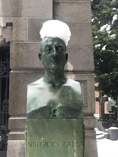 Il Cimitero Monumentale dopo una nevicata è un luogo dove si possono scattare belle fotografie, lo sapevamo, ma nessuno dei tre, probabilmente, immaginava quel giorno d’imbattersi in un soggetto inaspettato, sul quale esercitare tutta la nostra fame di illusione: a causa di un fenomeno fisico e meccanico, la neve, fiocco dopo fiocco, si era cumulata sulla porzione sommitale di moltissime statue, cioè sul cranio di busti raffiguranti uomini defunti, donne defunte, vecchi o bambini morti ottanta o cento anni fa, prendendo la forma cilindrica di un cappellino senza falda, una specie di colbacco o di fez, magari inclinato sulle ventitré.