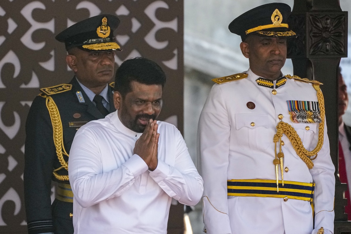 Il presidente Anura Kumara Dissanayake durante le celebrazioni del giorno dell’indipendenza, il 4 febbraio 2025 (AP Photo/Eranga Jayawardena)