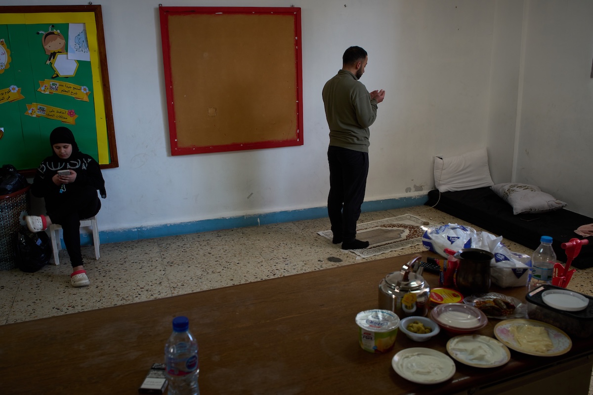 Due famiglie sfollate dal sud del Libano pranzano in una scuola adibita a rifugio a Beirut, Libano, 25 marzo (AP Photo/Emilio Morenatti)