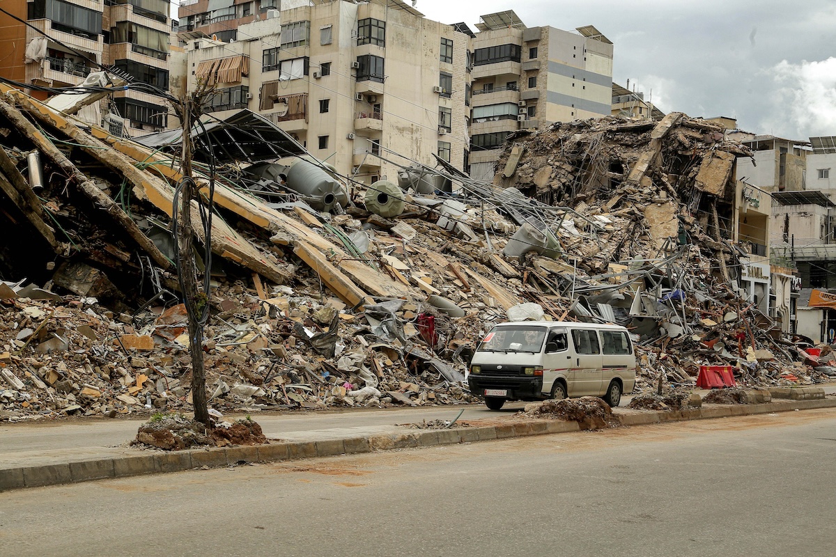 Un furgoncino del trasporto pubblico passa davanti a un edificio distrutto, periferia sud di Beirut, Libano, 25 marzo (Marwan Naamani/ZUMA/Ansa)