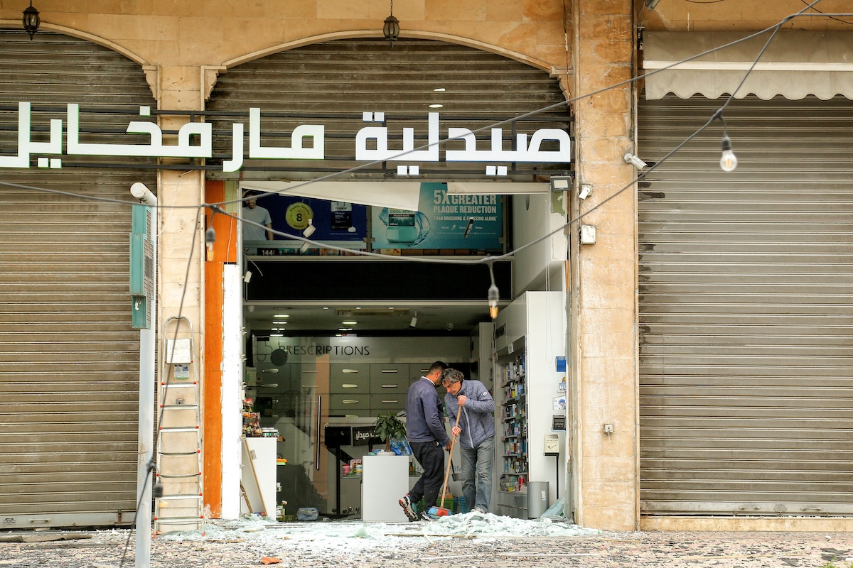 Due uomini ripuliscono l’ingresso della loro farmacia da macerie e vetri rotti, periferia sud di Beirut, Libano, 25 marzo (Marwan Naamani/ZUMA/Ansa)