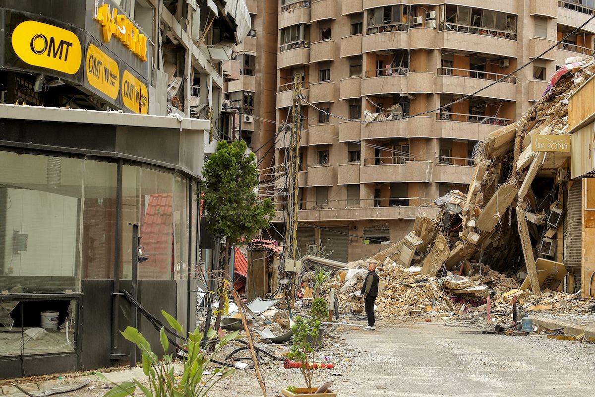 Un uomo guarda un edificio distrutto, periferia sud di Beirut, Libano, 25 marzo (Marwan Naamani/ZUMA/Ansa)