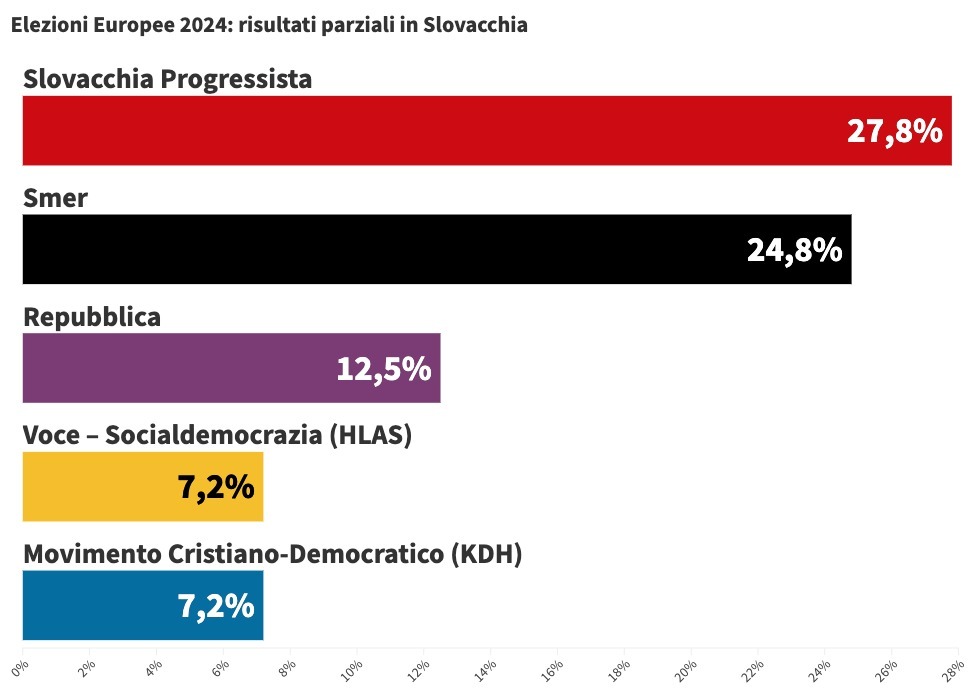 In Slovacchia i risultati ufficiali delle elezioni europee coincidono con quelli diffusi qualche ora fa dai principali giornali a partire da fonti interne ai partiti: il partito populista e filorusso del primo ministro Robert Fico, Direzione–Socialdemocrazia (Smer), è arrivato secondo con il 24,76 per cento dei voti, dietro a quello di opposizione filoeuropeo Slovacchia Progressista (PS), che ha preso il 27,8 per cento. È da considerare una grande sconfitta per Fico dato che tutti i principali sondaggi lo davano in vantaggio, specialmente da quando era stato vittima di un grave attentato poche settimane fa.