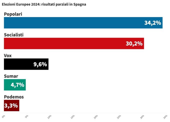 In Spagna non è prevista una soglia di sbarramento. Tra i partiti che dovrebbero ottenere almeno un seggio al Parlamento Europeo ci sono anche Podemos (sinistra, 3,3 per cento), Uniti per la Catalogna (2,6 per cento) e la Coalizione per un’Europa Solidale, una coalizione di vari partiti regionali di ispirazione europeista.